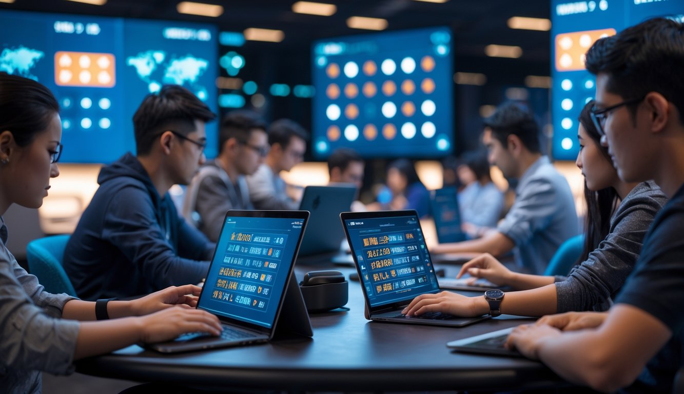 Suasana turnamen Sic Bo internasional online dengan pemain dari berbagai negara menggunakan laptop dan tablet untuk bermain.